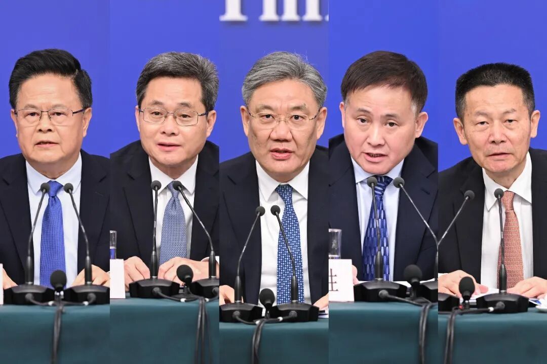 这是郑栅洁、蓝佛安、王文涛、潘功胜、吴清连续三年同时就发展改革、财政预算、商务、金融证券等相关问题回答中外记者提问。